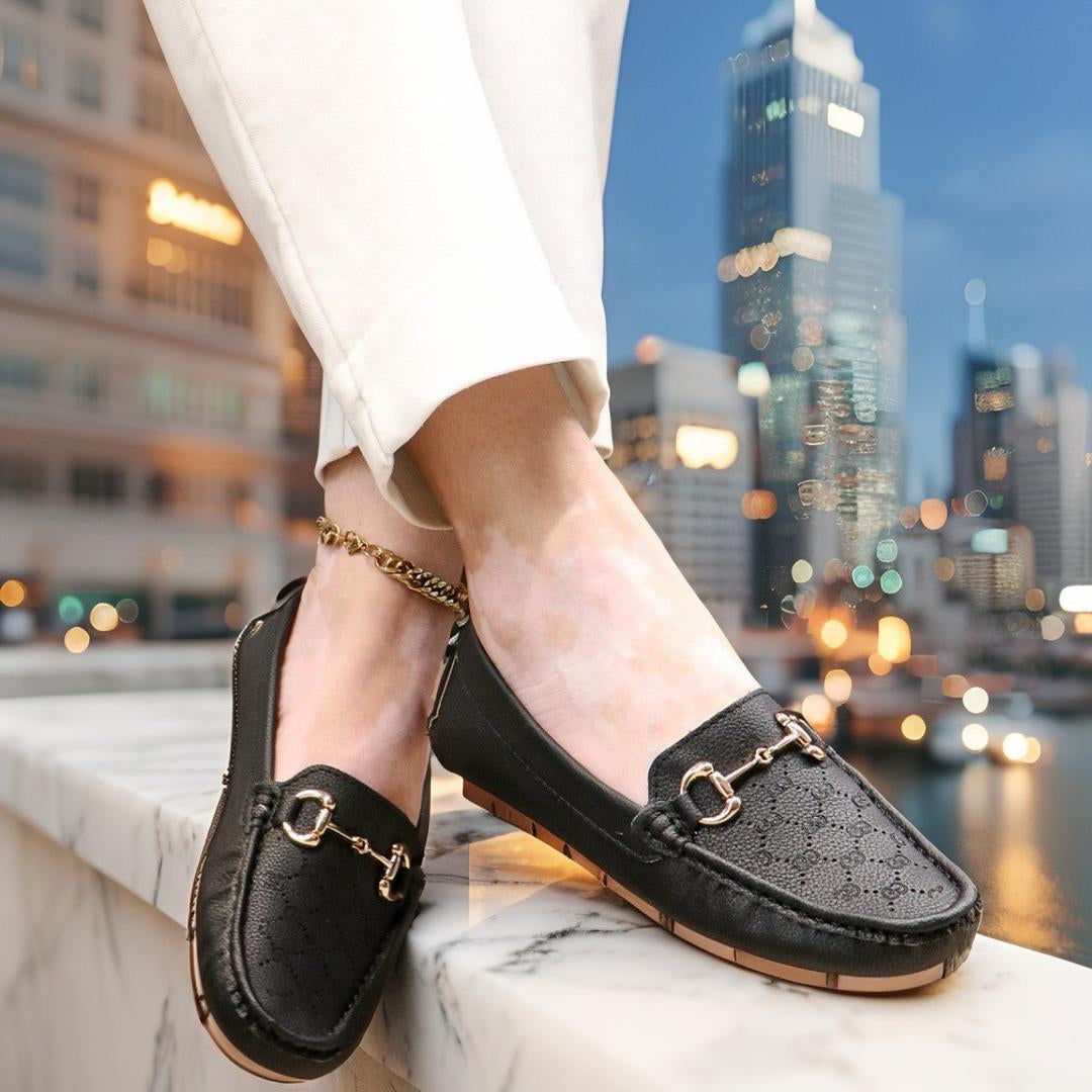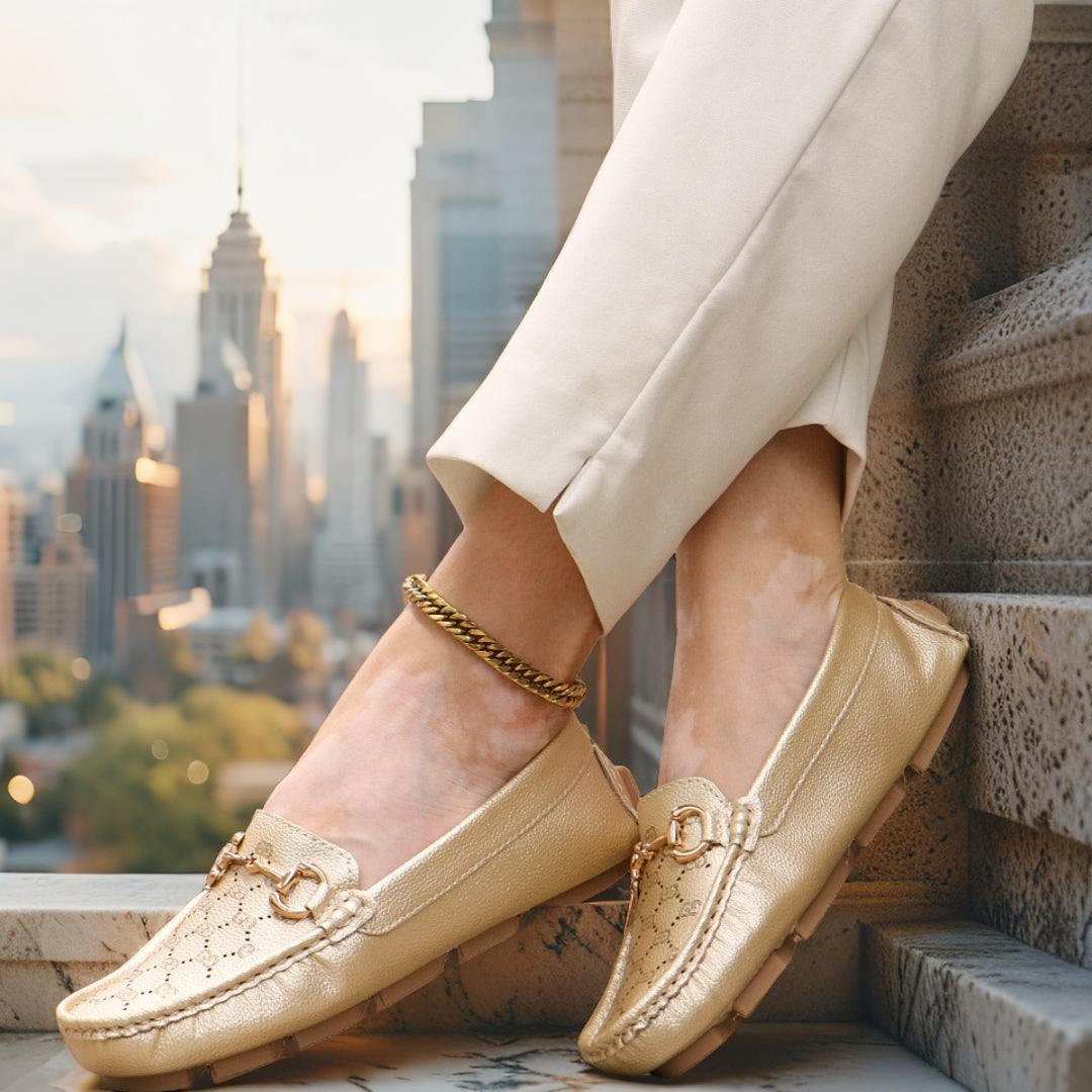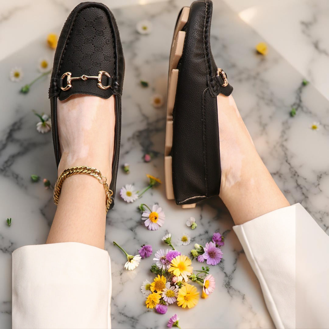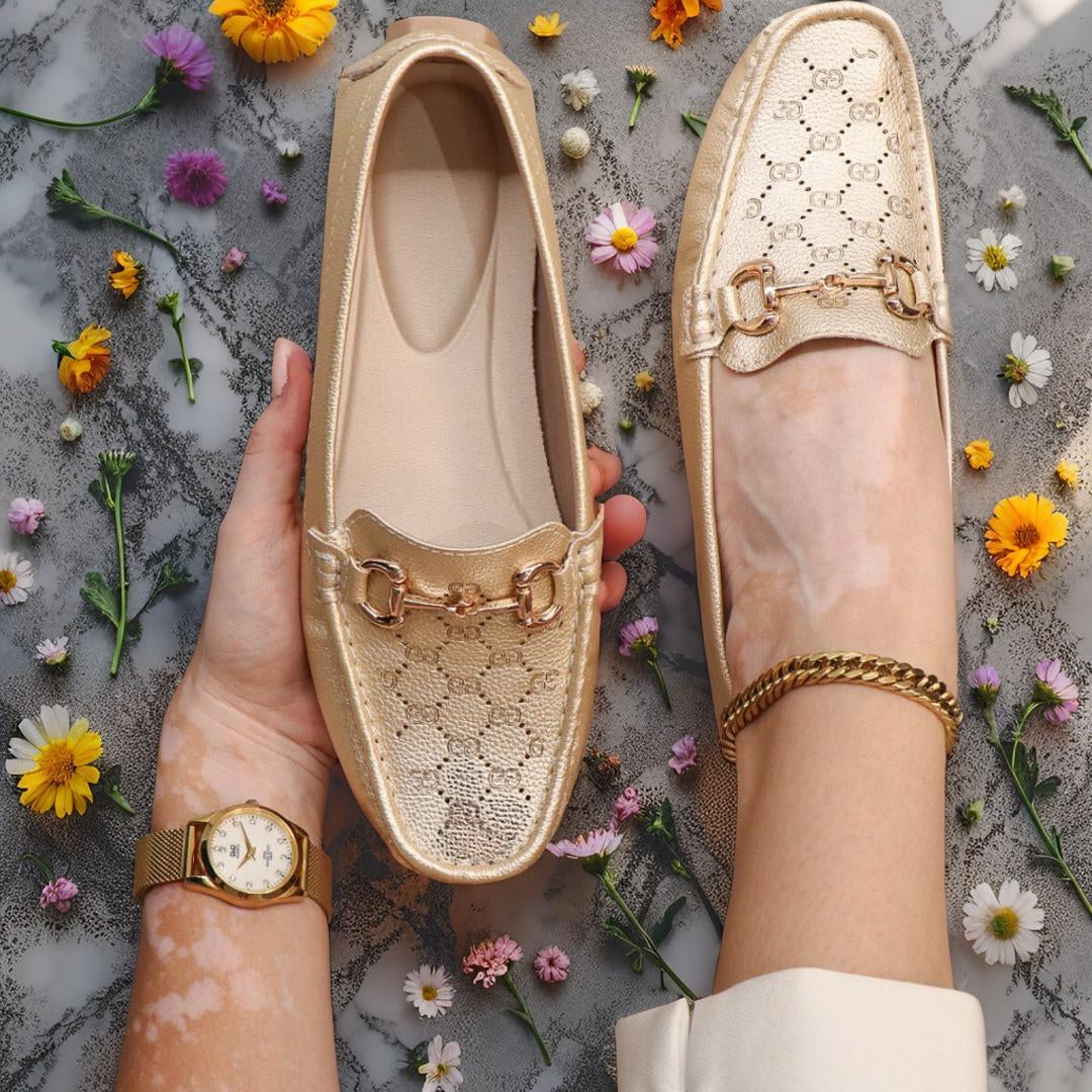 Diseñados con un acabado tipo cuero texturizado, estos mocasines destacan por su detalle metálico dorado en el empeine, aportando ese toque sofisticado que transforma cualquier outfit.